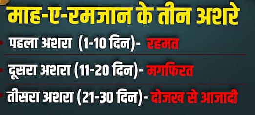 “1.पहला अशरा (रहमत का अशरा)… रमजान के पहले 10 दिन रहमत के होते हैं। इस दौरान रोजा-नमाज करने वालों पर अल्लाह की रहमत होती है। मुसलमानों को ज्यादा से ज्यादा दान कर के गरीबों की मदद करनी चाहिए और हर एक इंसान से प्यार और नम्रता का व्यवहार करना चाहिए।