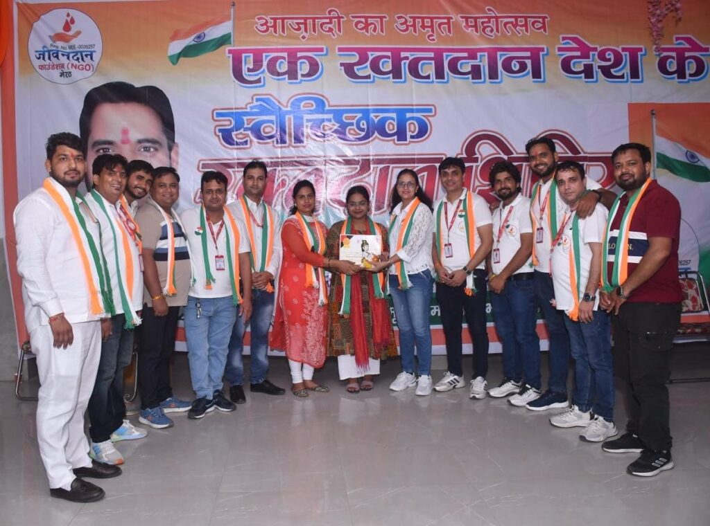 स्वतंत्रता दिवस के शुभ अवसर पर जीवनदान फाउंडेशन द्वारा रीता ब्लड बैंक के संयोजन से रक्तदान शिविर का आयोजन त्रिमूर्ति फार्म हाउस भोला रोड पर किया गया है. जिसमें देश के नाम सभी रक्तदाताओं द्वारा बढ़ चढ़कर हिस्सा लिया गया. कार्यक्रम के मुख्य अतिथि आयुष त्यागी जिला अध्यक्ष हिन्दू युवा वाहिनी गाजियाबाद ,डॉक्टर हीना सिंह एमबीबीएस एवं विशिष्ठ अतिथि अमित गर्ग मूर्ति,पार्षद राजेंद्र उपाध्याय, शाशवतनन्द गुरुजी रहे.