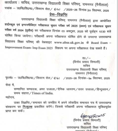 यह जानकारी देते हुए बोर्ड के सचिव विनोद प्रसाद सिमल्टी ने बताया कि हाईस्कूल एवं इण्टरमीडिएट की बोर्ड परीक्षाफल सुधार परीक्षा वर्ष 2025 (प्रथम) तथा परीक्षाफल सुधार परीक्षा वर्ष 2024 (तृतीय) का परीक्षाफल शुक्रवार 3 अक्तूबर को परिषद सभागार में पूर्वाह्न 10:30 बजे घोषित किया जायेगा।